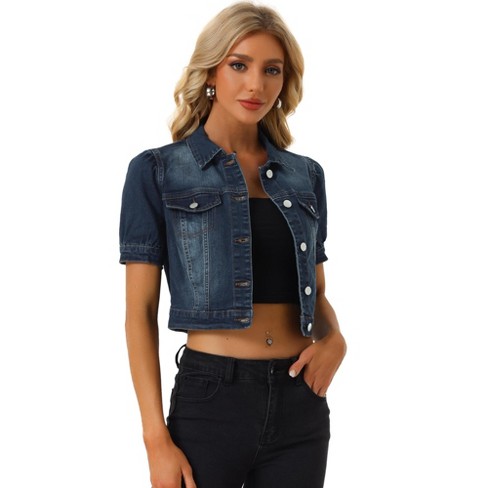 Allegra K Women s Casual Point Collar Button Down Puff Sleeve Crop Denim Jackets Dark Blue X Large Very well made.