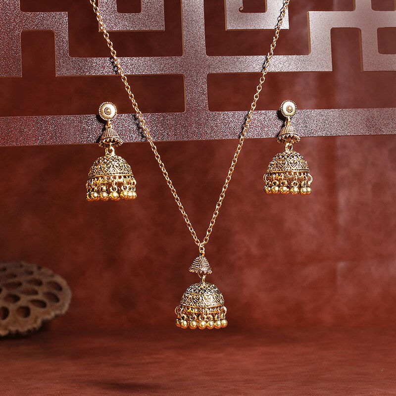 Ethnic Indian Earrings Necklaces Set Boho Retro Gold Big Bell Very well made.