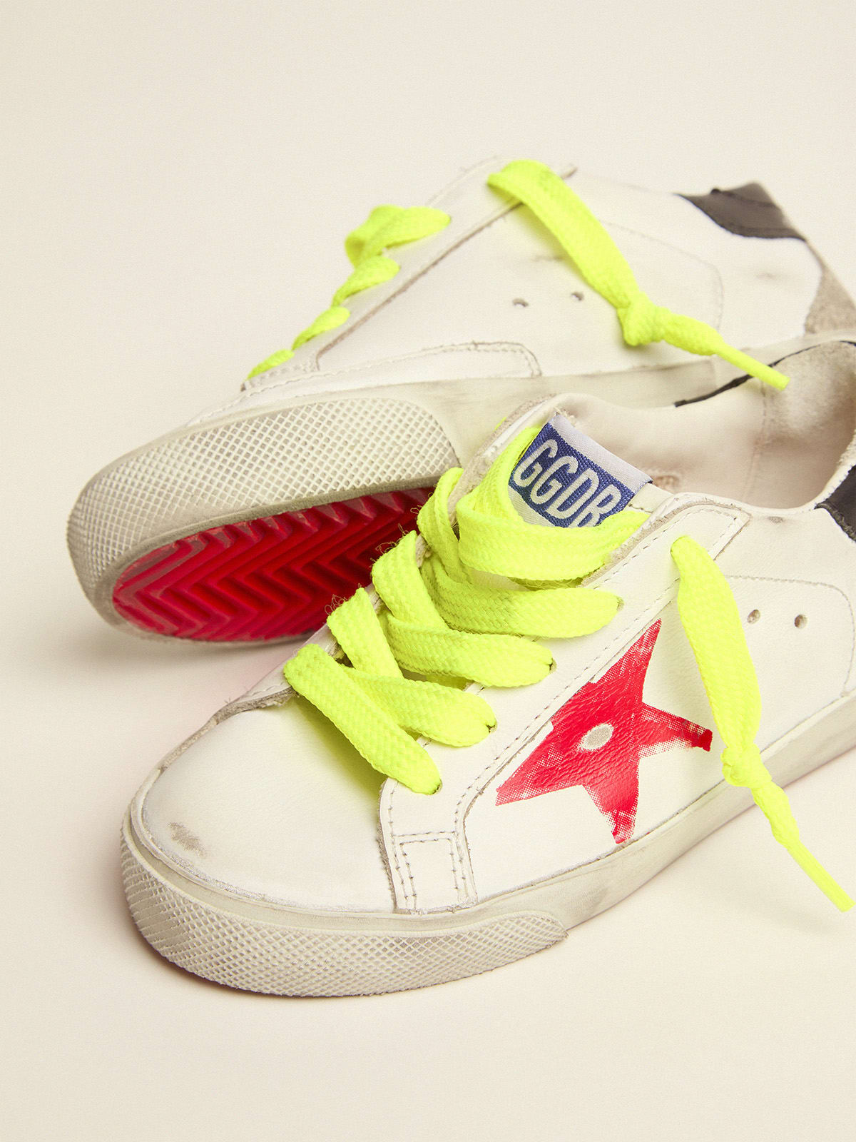 Super Stars sneakers with neon yellow hiking laces Very well made.