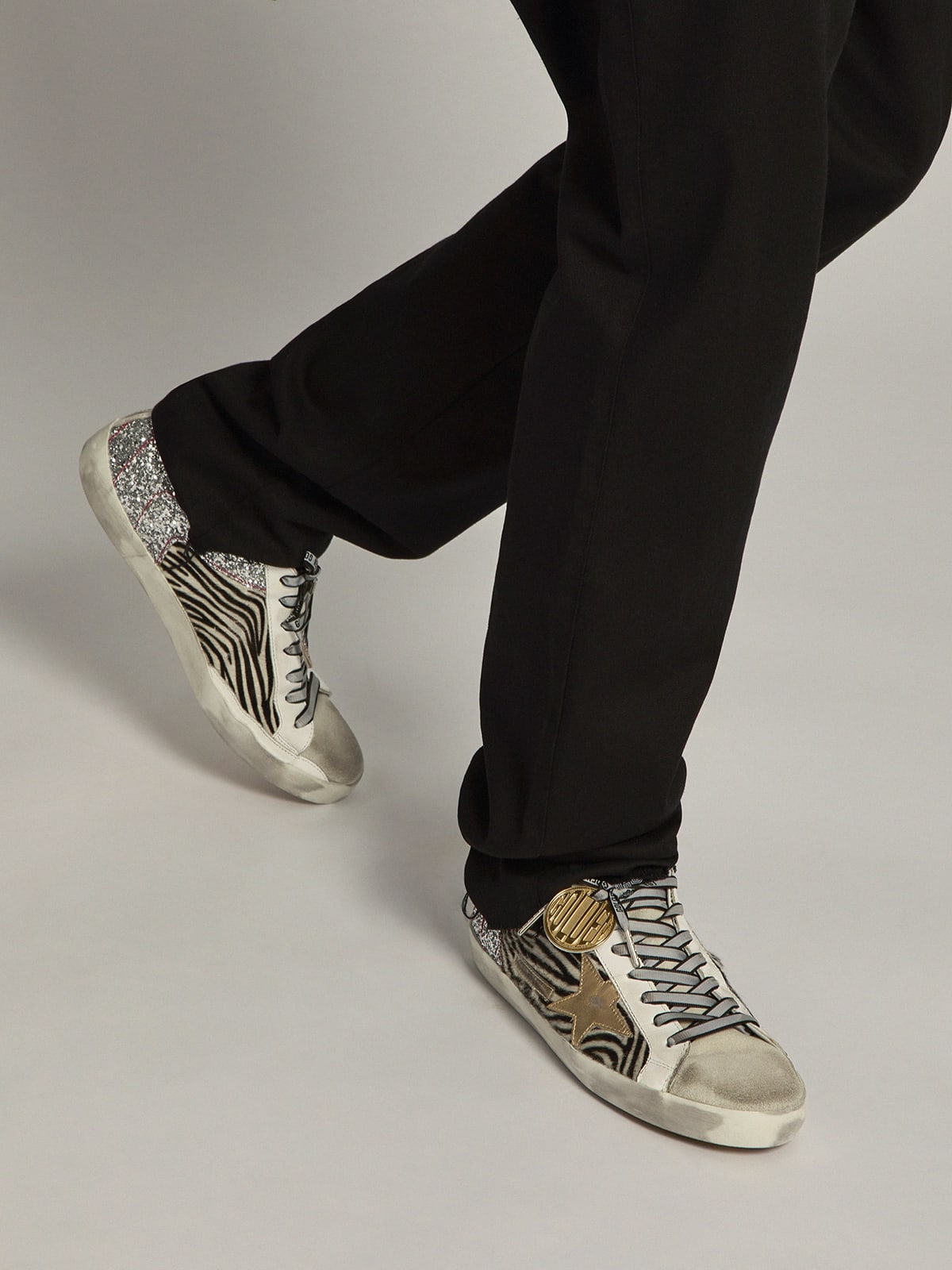 Men s Super Star sneakers in zebra print pony skin and silver glitter Very well made.