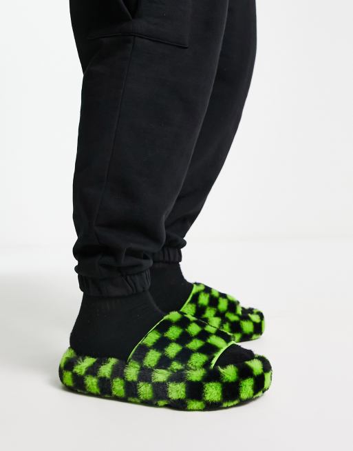 ASOS DESIGN chunky slippers in green checkerboard faux fur Very well made.