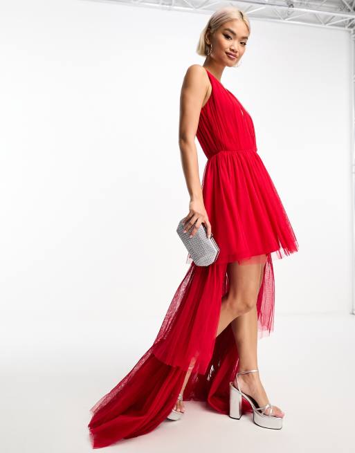 Lace Beads tulle high low plunge maxi dress with tiered skirt in red Very well made.