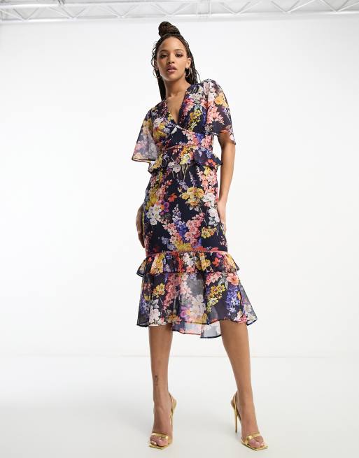 Hope Ivy Marinbl midikl nning med kontrastf rgad spets volang och f rgglada blommor Very well made.