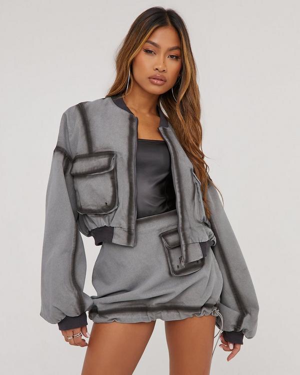 Oversized Contrast Seam Detail Cropped Bomber Jacket In Grey Acid Wash Very well made.