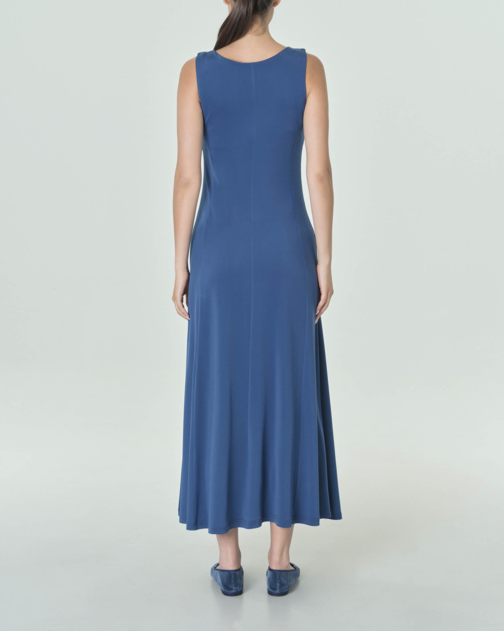 Abito lungo blu China smanicato in jersey stretch dalla linea svasata Very well made.