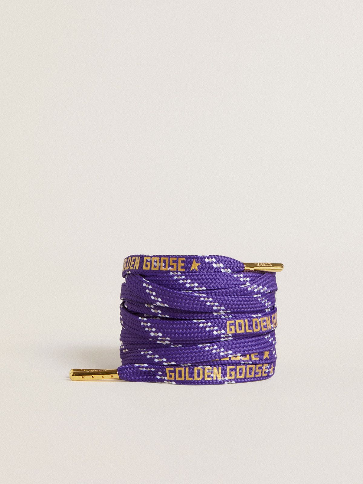 Purple laces with decorations and contrasting gold colored logo Very well made.