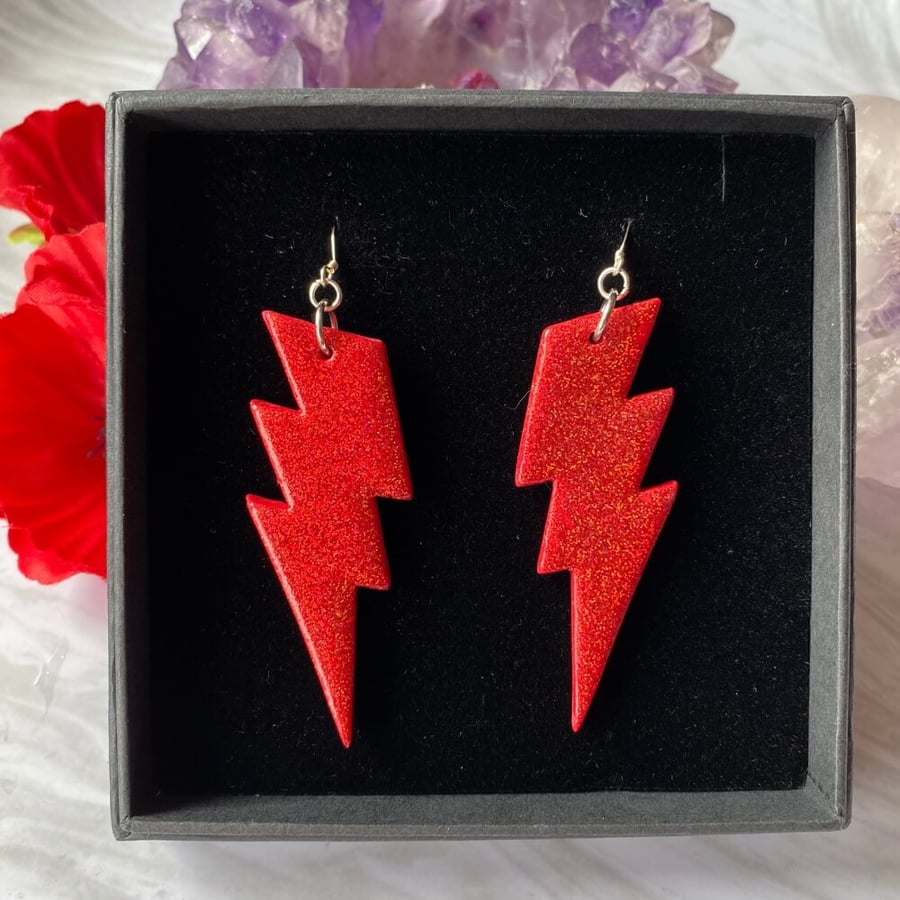 Red lightning bolt glitter earrings. Folksy Very well made.