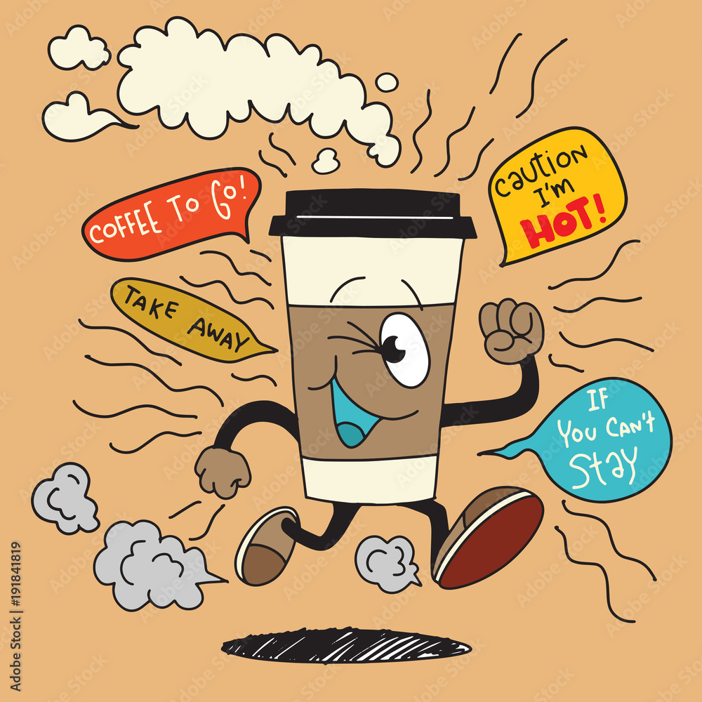 Vector illustration of smile takeaway coffee cup running. Stock Very well made.