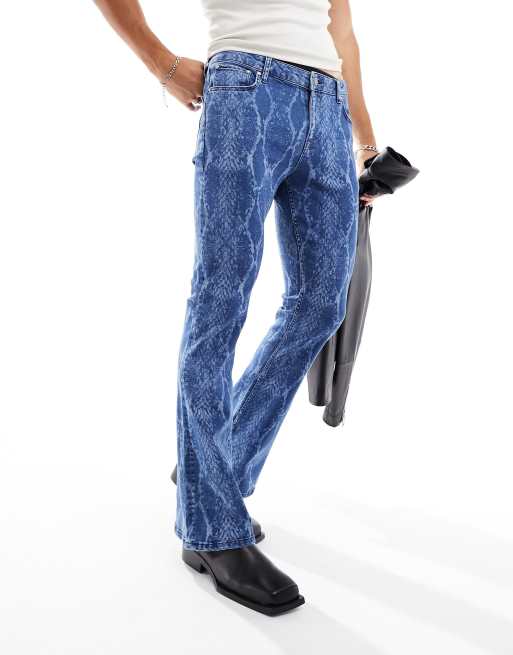 ASOS DESIGN flared jeans with snake print in mid wash blue Very well made.