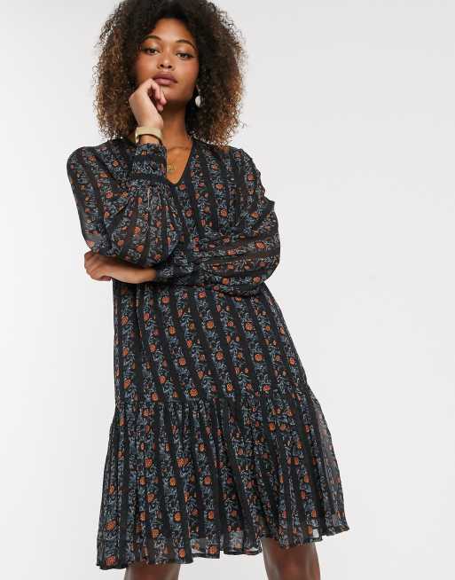 Y.A.S chiffon smock dress with drop hem in mixed floral and stripe Very well made.
