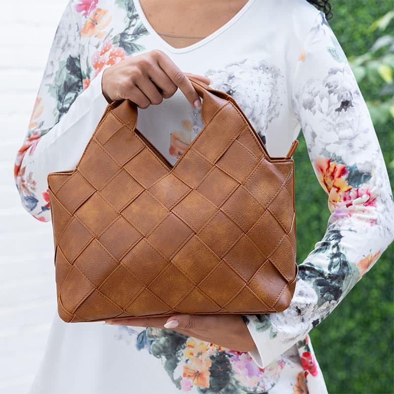 Tan Maddy Recycled Vegan Leather Woven Crossbody Bag Melie Bianco Very well made.