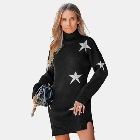 Women s Star Print Turtleneck Mini Sweater Dress Cupshe l black Very well made.