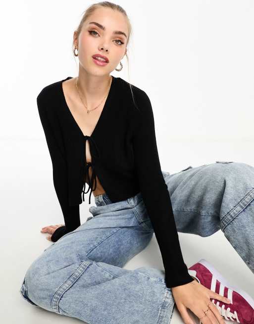 Striped Tie Front Crop Knit Top Versatile Long Sleeve Knit Cardigan For Spring Fall Women s Clothing Very well made.