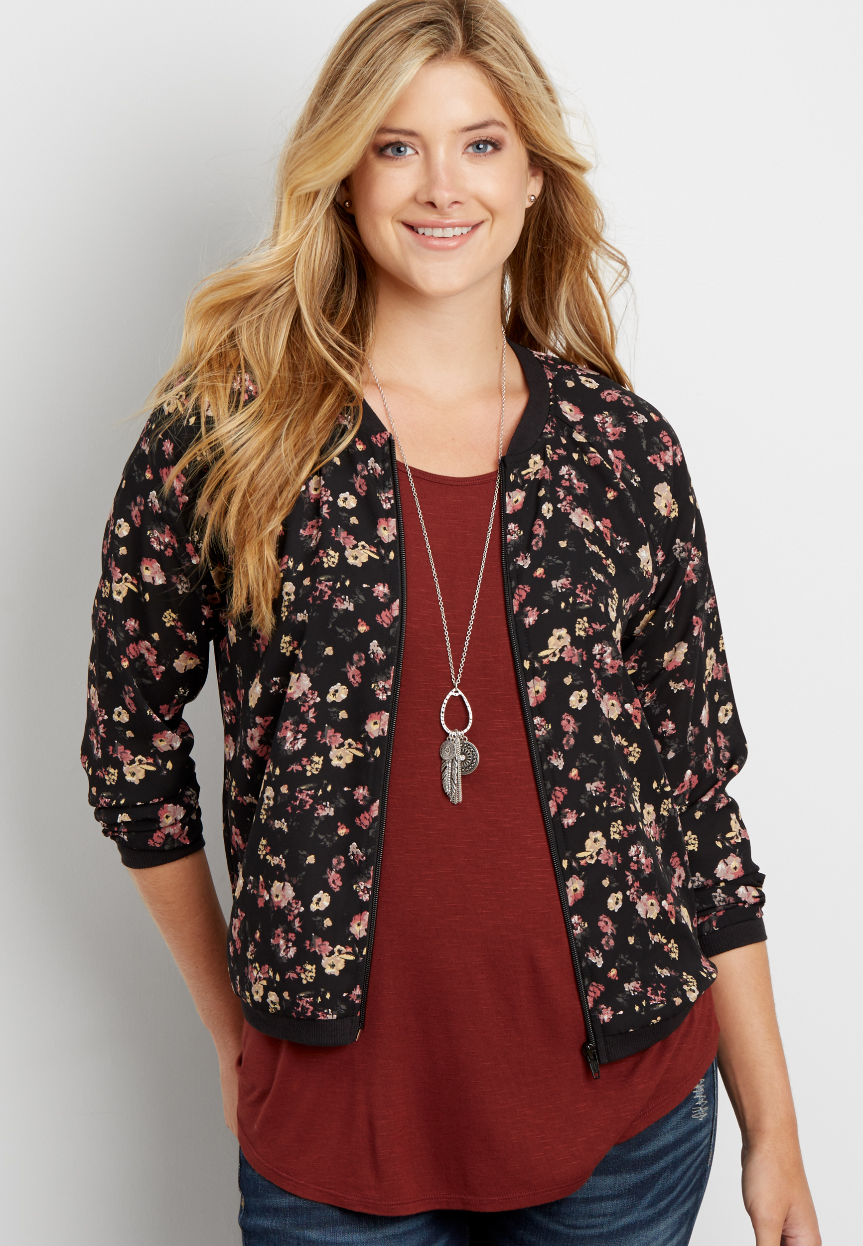 Plus Size Black Floral Printed Bomber Jacket at MARIA VINCENT Very well made.