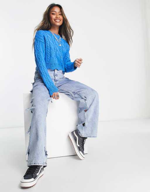 ASOS DESIGN crop cable sweater with nibbled hem in blue ASOS Very well made.