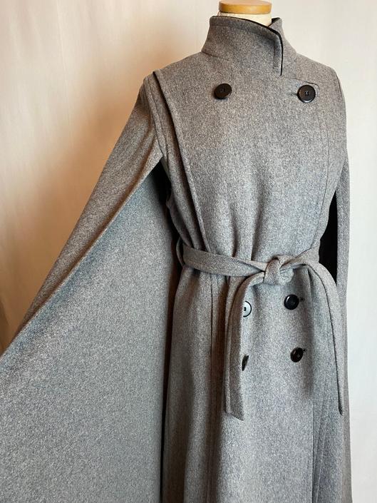 Vintage Wool cape grey with velvet black trim fitted belted Very well made.