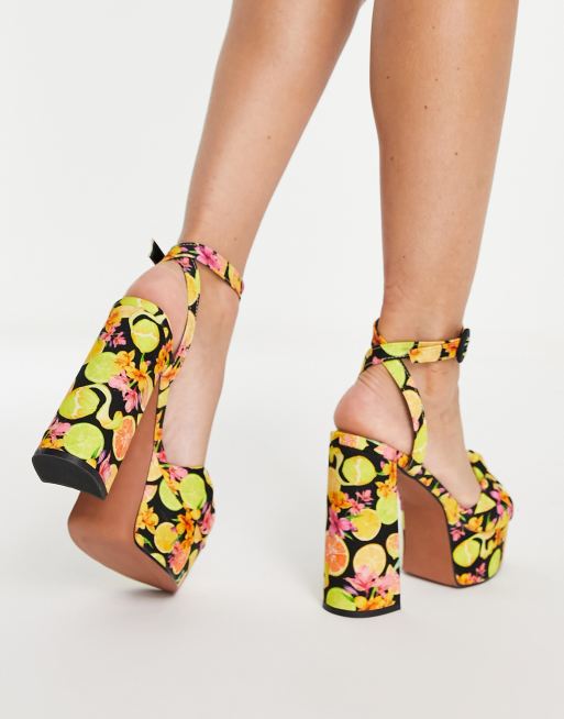 ASOS DESIGN Note knotted platform heeled sandals in fruit print ASOS Very well made.