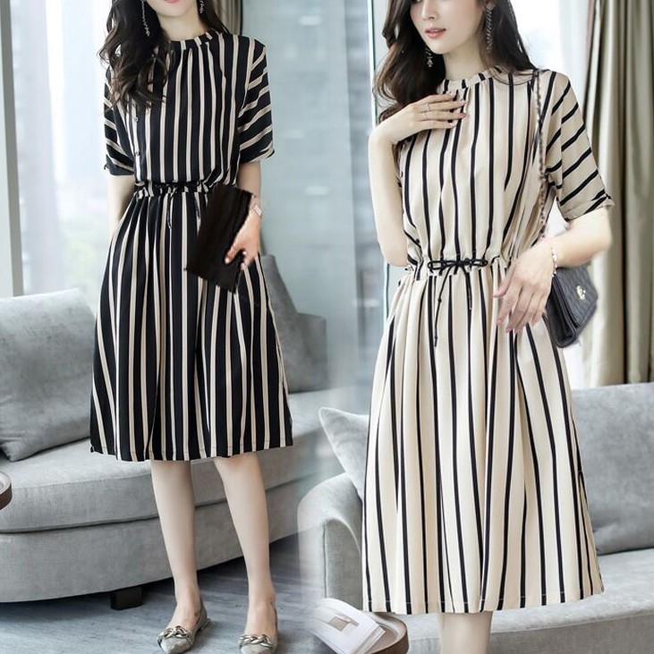 Women s 3 4 sleeve high neck midi dress black white stripe line Very well made.