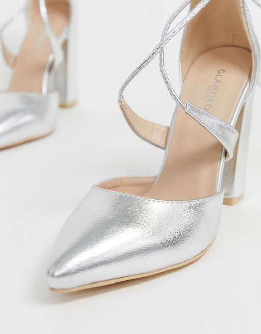 Glamorous Wide Fit silver block heeled tie up pumps Very well made.