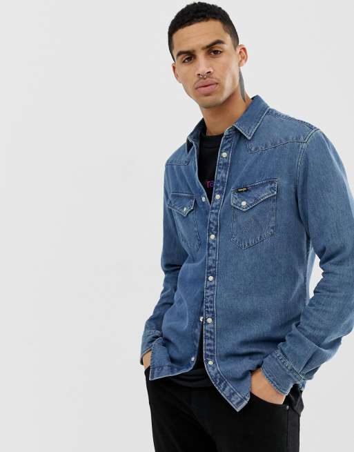 Wrangler western denim shirt slim fit in blue indigo mid wash Very well made.
