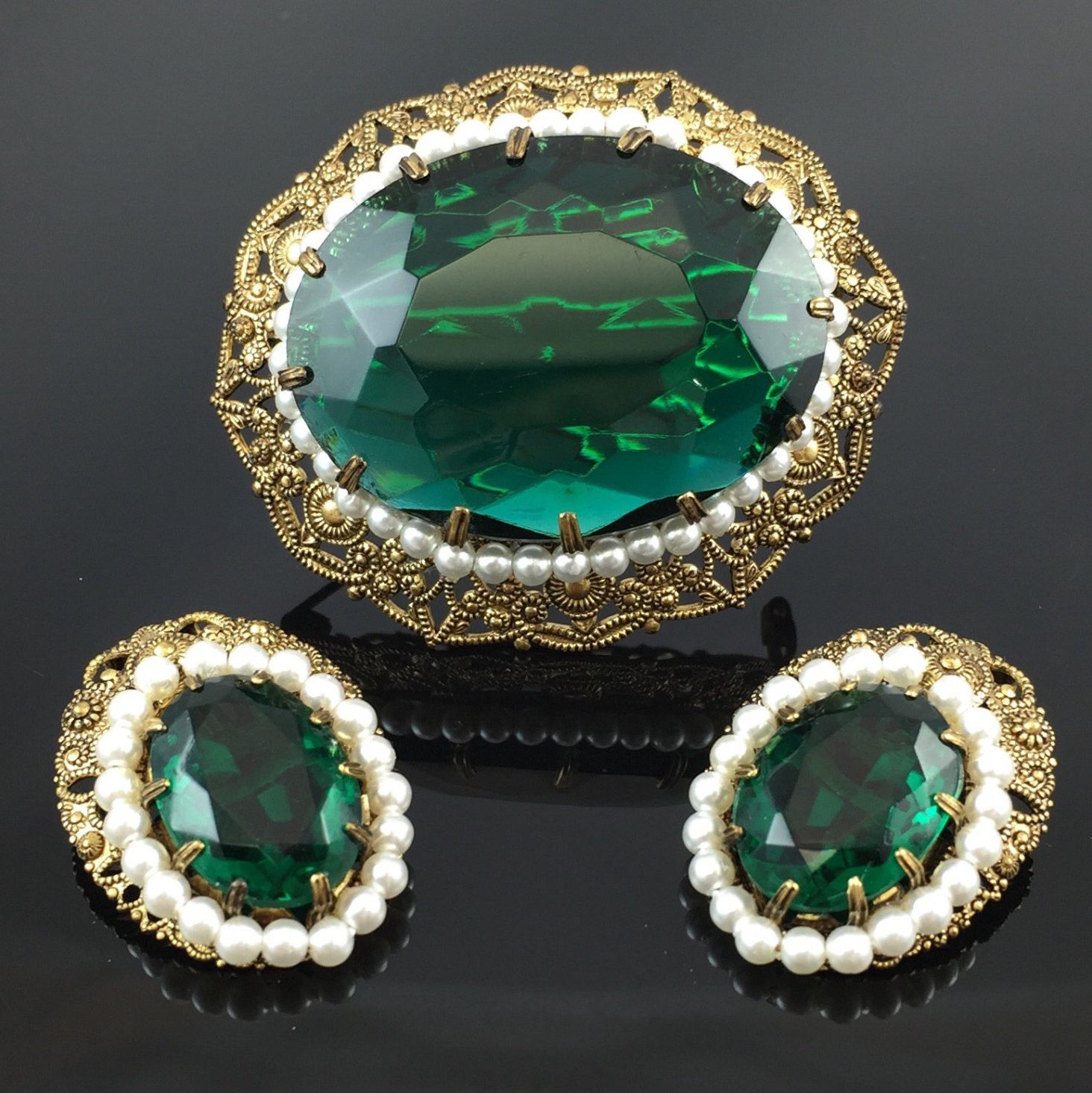 West Germany Emerald Green Glass Brooch Earrings Set Vintage 1950s Very well made.