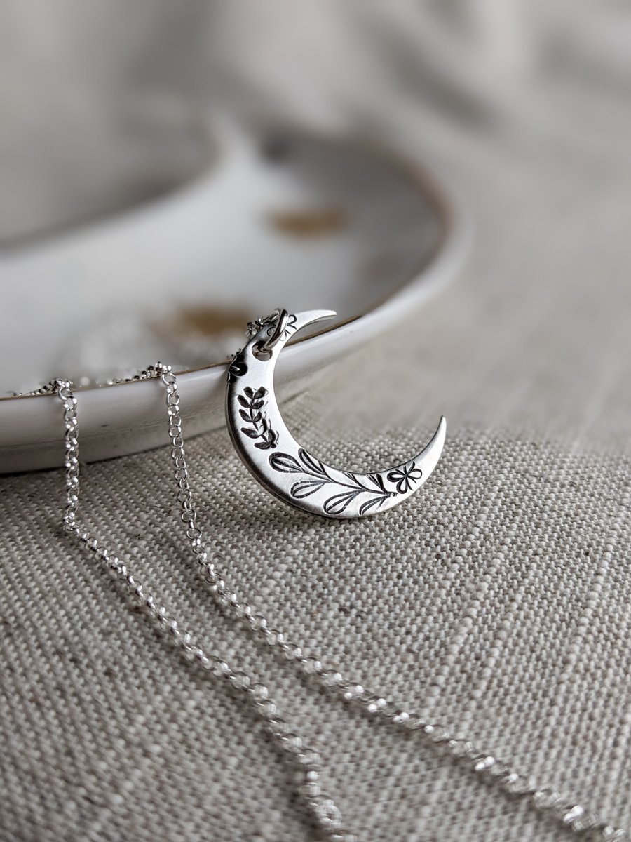 Silver crescent moon necklace botanical hand stamped silver moon pendant Very well made.