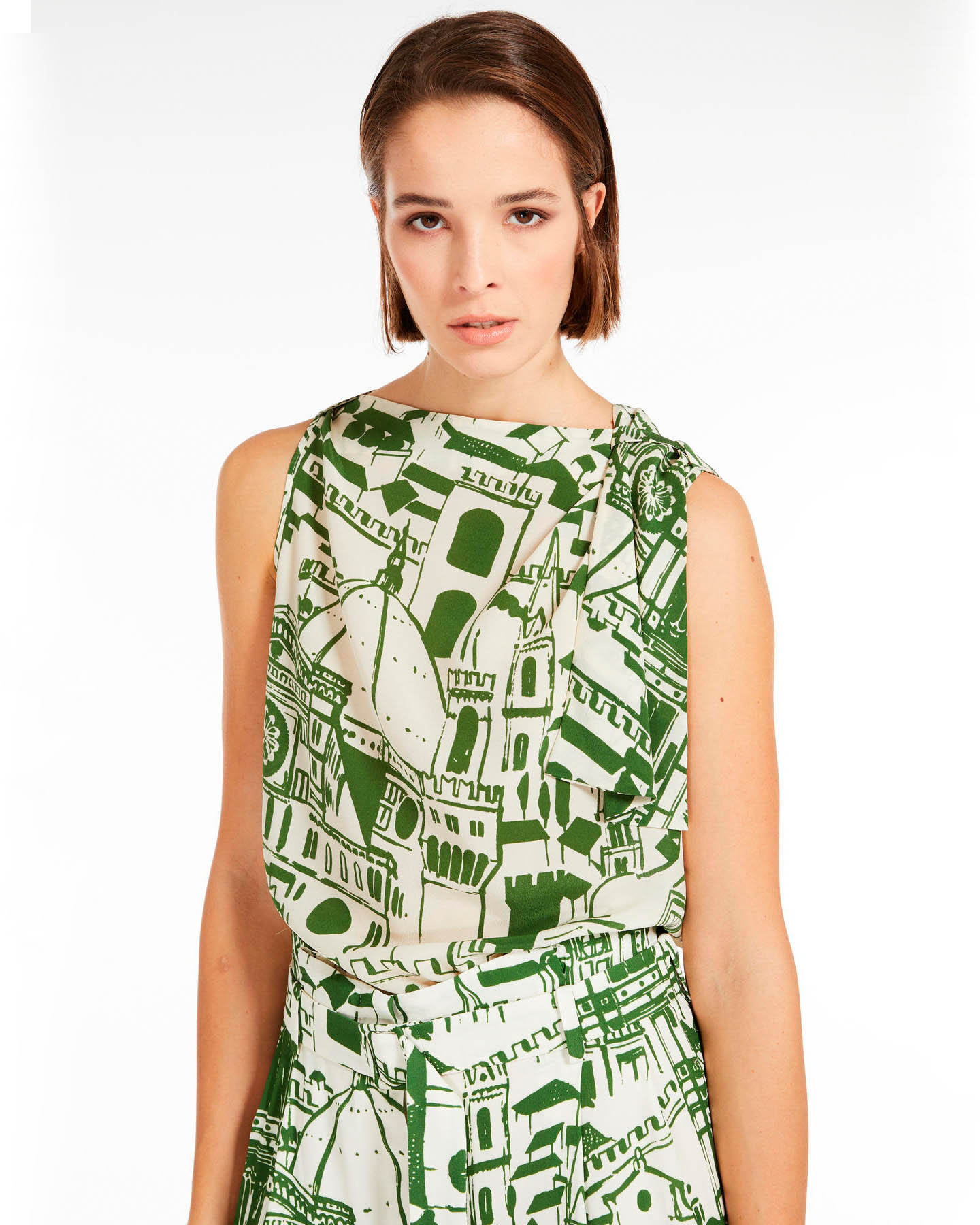 Blusa avorio in raso di seta senza maniche con motivo verde Very well made.