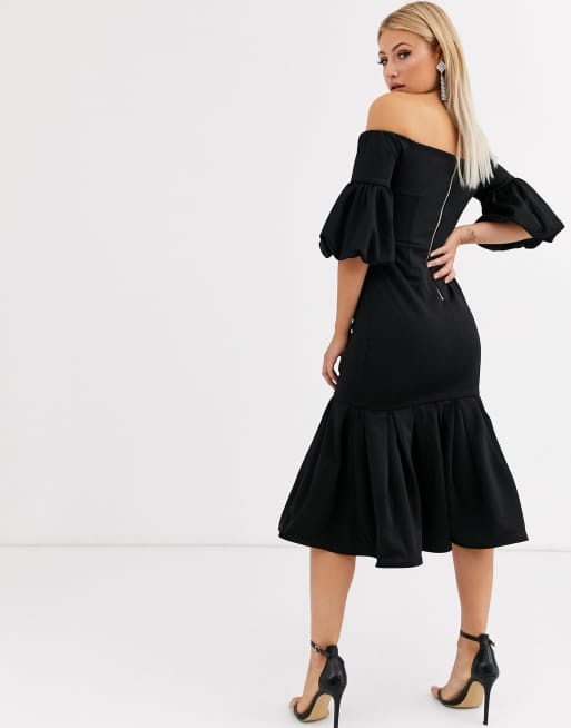 Boohoo bardot plunge midi dress with puff sleeves and frill hem in Very well made.