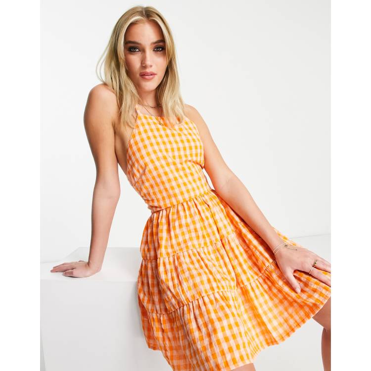 Influence tiered mini cami dress with bow back in orange gingham Very well made.