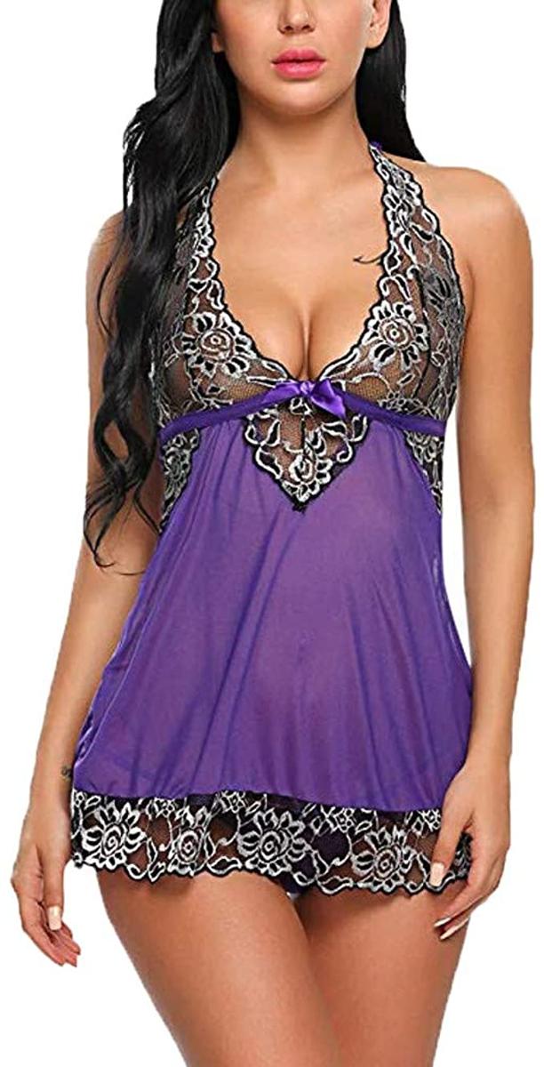 Sexoo Babydoll Lingerie Donna Camicia da Notte Sexy Completi Intimi Biancheria Intima Pizzo Lace Aperto con Scollo a V G String Grande Size S 4XL Very well made.